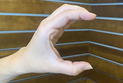 Start by making a stop sign with your hand (keep your hands and fingers straight). From there, gradually move your hand to make a C shape, or a claw shape. Hold this position and repeat 5 times on each hand.