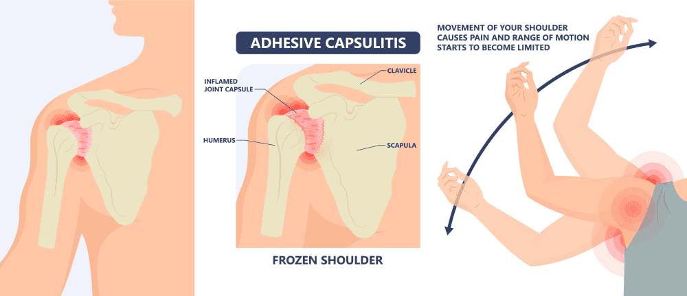 Frozen shoulder, or adhesive capsulitis, is when your capsule becomes inflamed or irritated, and then sticks together (adhesive) causing decreased range of motion. Most people become unable to raise their arm above their heads.